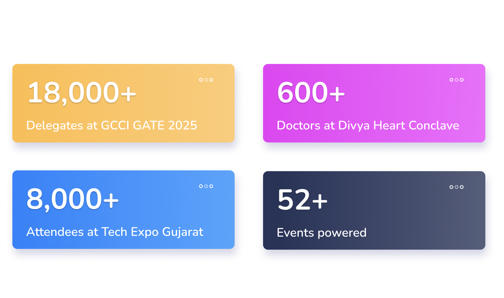 Gujarat’s largest business conference. Multi-day event with badge printing at every gate, VIP lane management, and multi-gate coordination. [Tag] 18,000 delegates