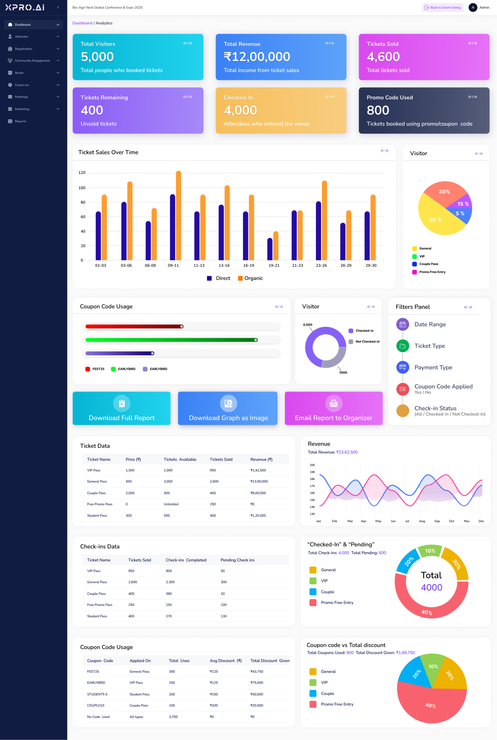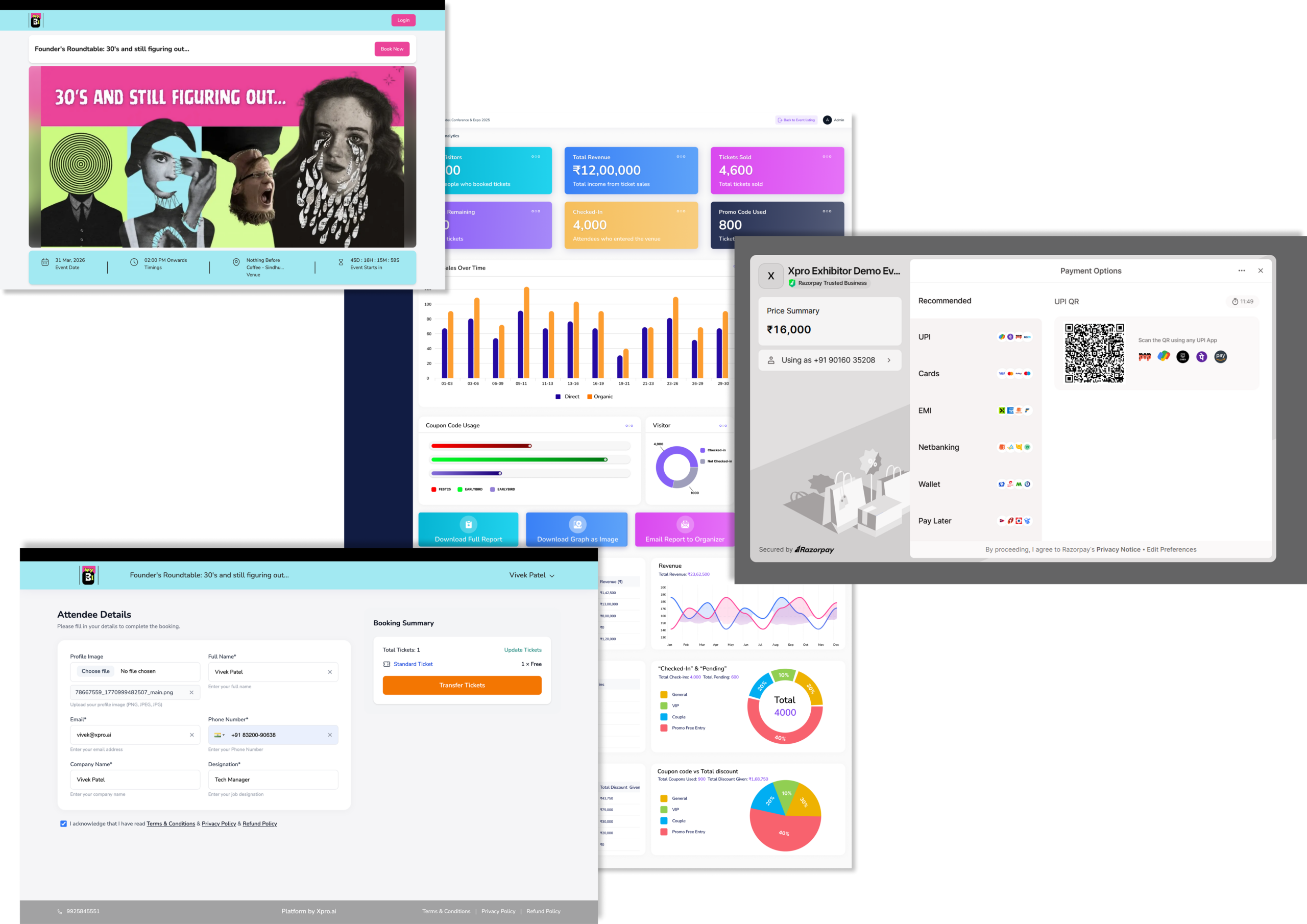 Integrated payment gateways that support UPI, debit and credit cards, net banking, and international payments. Attendees pay and receive a receipt instantly. You see every transaction in real time.